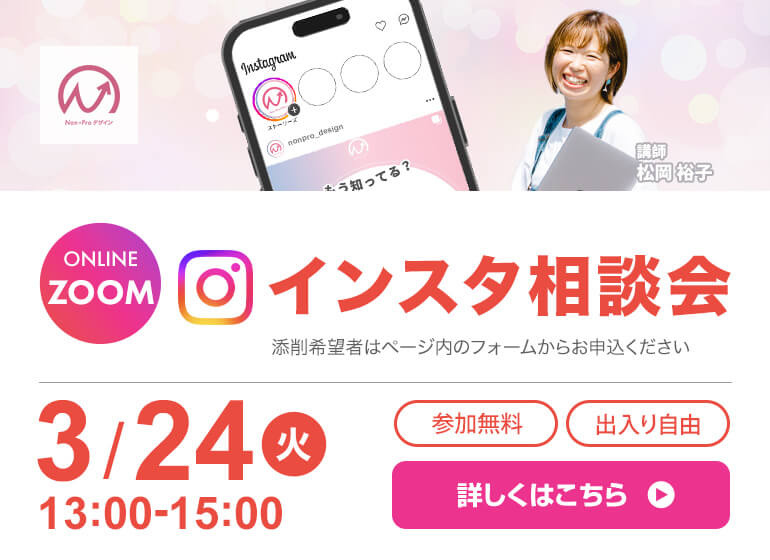 インスタの発信やアカウント運営をより良くしたい方へ向けて開催している、インスタ相談会を3月は3月24日(火)に開催します! 開催について 添削・相談できる内容 Instagram運営に関することなら、幅広くご相談いただけます! カリキュラム『Instagram活用編』も公開中! Instagram運用のをより深く学べるカリキュラムを掲載しています!是非こちらで基礎を学んだ上でグループコンサルにお越しください^^Instagram活用編はこちら 毎回、ひとつでも気づきや改善のヒントを持ち帰ってもらえるようにInstagram運営のプロ講師がしっかりサポートしていきます。 添削がない方も参加OK!ぜひお気軽にご参加ください^^